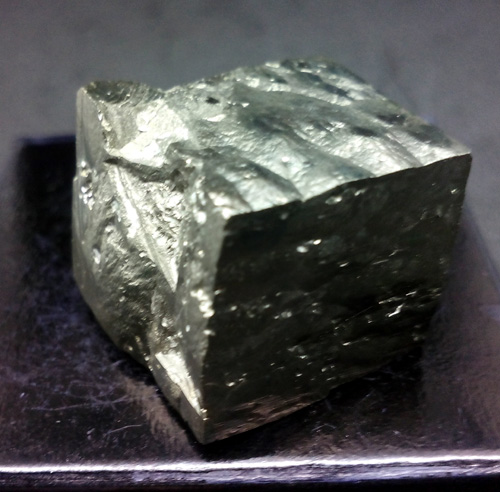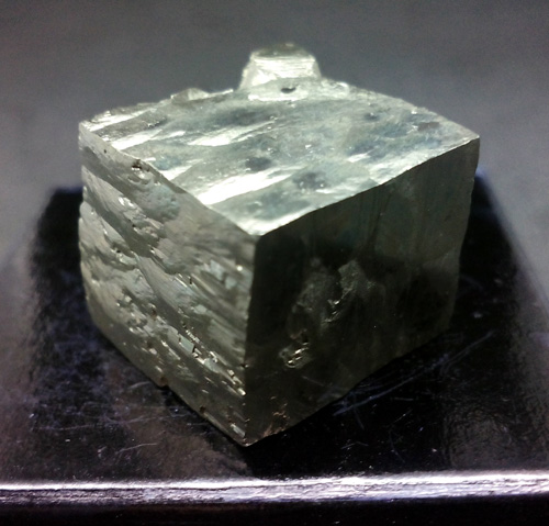 Pyrite cube of 1,5 x 1,3 x 1,5 cm. approx. Its faces presents curious reliefs. (The dark base measures 4x4 cm.)