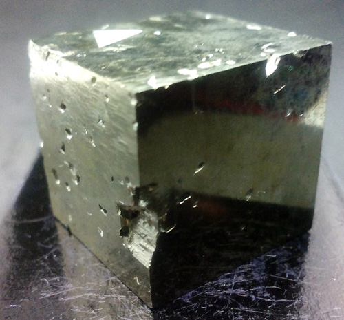 Pyrite cube 1,9 x 1,8 x 1,9 cm. approx. Its faces are smooth and bright. It has several defects. (The dark base measures 4x4 cm.)