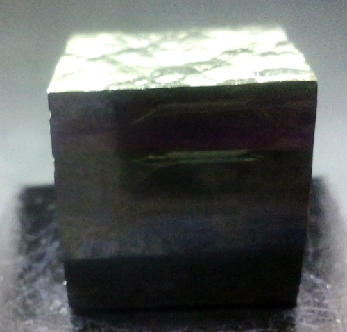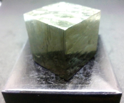 Pyrite cube 1.8 x 1.9 x 1.9 cm. approx. Its faces are smooth and bright. (The dark base measures 4x4 cm.)